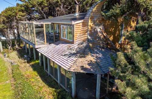 This house is nestled on the edge Yachats' cedar forest overlooking the rocky coast and a rare tide pool plateau;