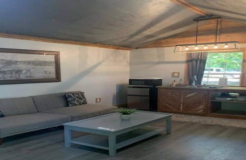 The pot of gold at the end of the rainbow! This tiny house in the Ouachita National Forest is perfect for a young couple who love nature. There is a lake for fishing, kayaking, and paddle boarding as well as a river access to float, fish, swim, or kayak. This small space is ideal for a single person, couple, or couple with single child. This tiny home has a lake view with mountains behind it. Although the house is private, the land is shared with other guests. We put the GLAM in GLAMPING.