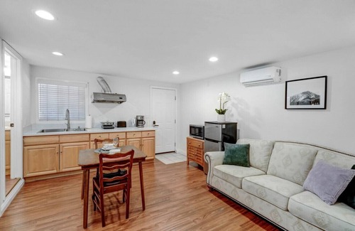 While it may be modest in size, this 400-square-foot studio makes up for it with its warm and cozy ambiance with the help of its modern furnishings and soothing decor. Unwind in the comfortable queen bed, adorned with plush linens, or enjoy a quiet evening in the cozy seating area. Explore the natural beauty of the area with hiking trails and parks just a short drive away.