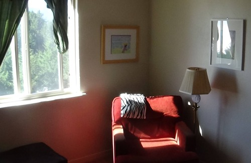 You get the whole lower unit close to 1000 square feet of living space, with a full bath, full kitchen, living area with majestic views of the ocean over the fir trees, and two bedrooms. Plenty of room for up to 6 people.