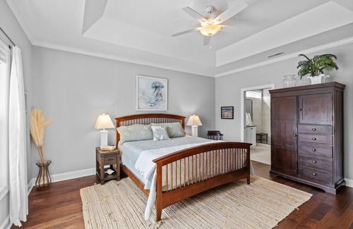 When all you want is to relax at home, head back to this sweet abode with several seating areas for gathering, and plenty of room for a boat trailer! The floorplan is open and bright, making it a snap to spend quality time together. The options abound at this spacious property, whether it’s easy conversation, making meals together, or sneaking off to read a book in a quiet corner. Speaking of which, there are three bedrooms to choose from to accommodate family, friends and guests for your ideal holiday! The options for sleeping include a primary suite with a king bed, a second bedroom with a queen and an additional bedroom with two twins. There is a generously sized kitchen for cooking together any time of day, beautifully appointed spa-like bathrooms, a laundry room (for packing light!) and the best for last… a sparkling salt water swimming pool that no one will be able to resist! The water is heated and cooled, making dips any time of day, any day of the year, an absolute dream!