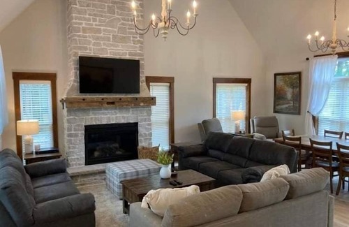 The Shoreline Cottage is locatedright on the water. With 4 bedrooms and 3.5 baths, there is a lot of room to spread out. When you arrive and enter the navy bluedoor, you will see this cottage has a great 4 season porch with a swing bed to relax the day away no matter the weather. There is also plenty of space in the porch to corral your stuff. Inside you will be welcomed into a quaint cottage kitchen with all the things you need to cook a meal or fix a cup of coffee. Seating options include a breakfast nook, kitchen island and a separate dining table for 10. The open concept living room and dining area has a huge cozy gas fireplace, 60'' smart tv and lots of comfy furniture to play games or plan the next day's adventure. The main level of this cottage includes the master bedroom with a king bed and an attached master bath, complete with a curbless walk in shower. Upstairs you will find the remaining 3 bedrooms (1 queen, 2 fulls, 2 twins) and 2 bathrooms, one with a shower/tub combo and one with a freestanding tub. The upstairs also has a separate lounge area with a second tv and a pull-out queen sofa bed. Complimentary dock, with 2 chairs on the sundeck, waterfront firepit (firewood provided), charcoal grill and 2 kayaks round out the amenities you can enjoy outside!