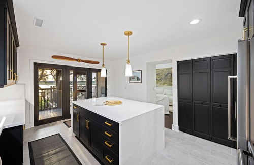 The villa showcases an upgraded modern style and the great room features vaulted ceilings and wood floors, and the large windows flood the room with natural light. There are water views from almost every room! This room also boasts electric blinds when you are ready for a rest from the sun. The spacious kitchen is a chef's dream. The huge central island with quartz countertop and three barstools is ideal for casual meals or for socializing.