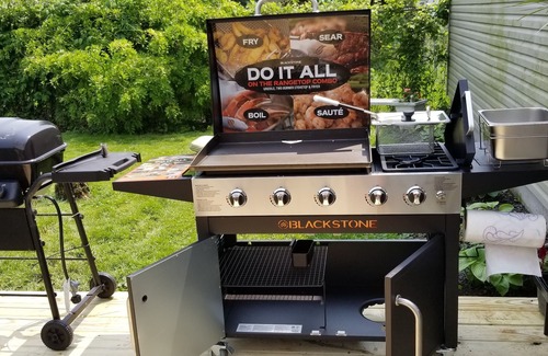 Grill and blackstone griddle for your outdoor cooking and relaxing without the worry of the children getting out of your sight or your dog getting away from you.