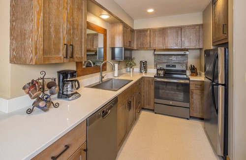 This 1 bedroom, 2 bathroom condo sleeps 6 with a king-size bed in the master bedroom, a murphy bed and sofa sleeper. The open-concept living room/dining room/kitchen area allows for everyone to spread out and socialize. The kitchen, with a dining table that seats 6, is spacious and has everything you need to cook breakfast before heading out for a fun-filled day of adventure!