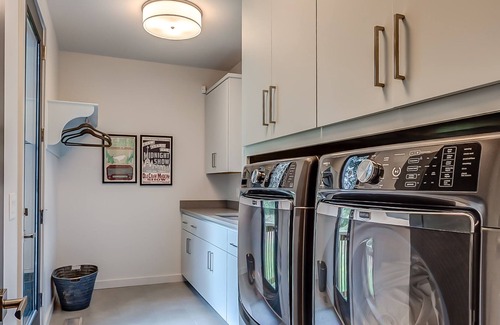 Head to the left down a hallway with coat and shoe cubbies to keep your belongings organized and find the first bedroom. It offers plush décor and bedding, 50” flat-screen TV, full bed and en-suite bathroom with walk-in shower and stackable washer and dryer.