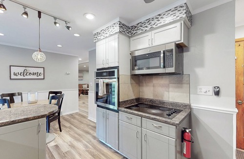 Step into the inviting living room, where a large sectional (seating for 6) surrounds an electric fireplace—perfect for relaxing after a day of adventures. A smart TV is ready for streaming your favorite shows or sports.
