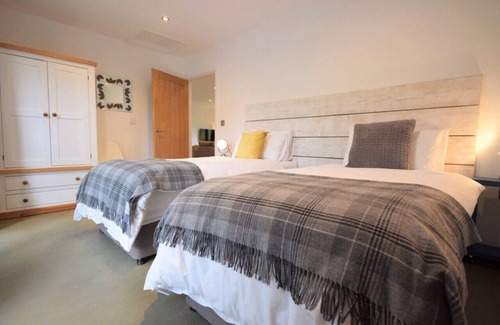 There is an open-plan lounge/kitchen/diner with French doors to outside, and the cosy sofa sits in front of a Smart TV and a wood burner. For those wishing to cook, the kitchen is well-equipped and offers an electric oven and hob, microwave, fridge/freezer, dishwasher and washing machine. The rest of the property comprises of two spacious bedrooms, a king-size with French doors to outside, and a twin zip-and-link (which can be made into a super-king-size on request). These are serviced by a fabulously contemporary bathroom with bath, separate shower and WC in a wet room with increased accessibility.