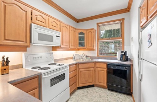 Large spacious kitchen fully equipped with, coffee maker, & dishwasher. You also have a large covered balcony with a propane BBQ. Kitchen table seats 6. You will love the area and being able to ski right to the village of the lift from outside the lobby!