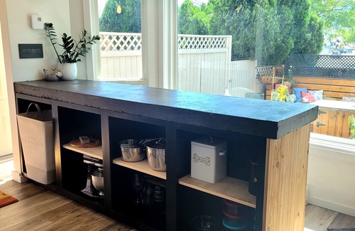 The main floor includes a spacious living that will comfortably seat 4, foyer with coat storage, modern kitchen with killer views for cuisine lovers and 8' long island, lower full wetroom with rainhead shower with independently controlled water pressure and temperature, and full laundry room. A Nespresso coffee maker is provided with gourmet coffee pods. Access to the backyard is off the laundry where you have a spacious 2 tiered yard with a lounger on the top deck and large outdoor bench on the lower. Even while hot, the bench provides shade and a nice breeze, perfect for reading a book or playing a game of cards. The living room includes air conditioning, 55" TV with basic streaming services, and a fireplace for winter stays. The kitchen has large, granite sink and commercial faucet, 5 piece appliance, basic small appliances, plates, and cutlery.