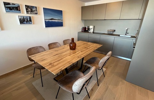 Discover Alpe d’Huez from our modern apartment which features a convenient ski-in/ski-out access and boasts a luminous and roomy interior as well as plush beds. After a day in the mountains, unwind in premium comfort complemented by our many on-site services. Enjoy amenities like heated ski storage, a gym, an indoor swimming pool, and private parking, guaranteeing an unforgettable retreat in a picturesque snowy landscape.