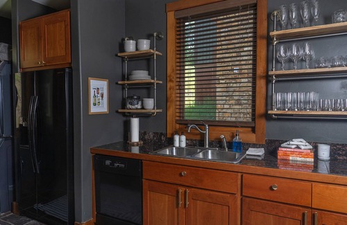 The kitchen is well equipped inclusive of a gas range and oven, refrigerator, dishwasher, toaster oven, microwave and walk-in pantry. The sliding door off the dining room allows you to step out and inhale the crisp mountain air on the private deck. Take a seat in the Adirondack chairs with a local brew, glass of wine or favorite libation while you grill your dinner then come inside to the dining room table which seats seven and the kitchen counter which seats two.