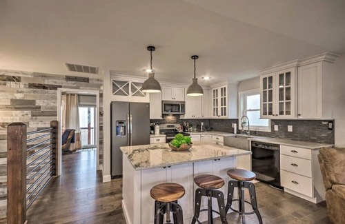 The cabin includes a well-equipped kitchen with a dishwasher, kitchen island, breakfast bar, and standard drip coffee maker. Free WiFi, linens, towels, and a washer/dryer are also provided. Please note that the property requires stairs and has parking available for two vehicles.