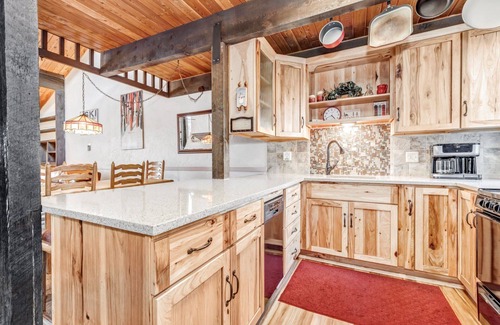 As you enter the home, you'll step onto the main level, where the spacious and inviting Great Room awaits. With a cozy wood-burning fireplace, beautiful leather sofa, and a large HDTV, it's the perfect spot to unwind after a day on the slopes or exploring all that Steamboat has to offer. The ceiling fan adds a nice touch, providing a refreshing breeze on warm summer days. The private deck, just off the living room, is a private retreat surrounded by evergreen trees, and the perfect spot to enjoy your morning coffee or an apres-ski beverage. In the kitchen, you'll find everything you need to prepare a delicious homemade meal. The stunning, one-of-a-kind cabinetry adds a touch of character and charm to the condo. The dining table seats six, and with the glow of the chandelier and natural light streaming through the large window in the Great Room, the space feels bright.