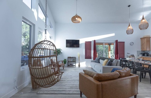 Zion Court House is brand new and perfectly positioned next to the hillside, offering unmatched views and privacy. Its modern yet artistic design combines calming mid-century and boho influences with natural elements, desert tones, and hillside vibes.