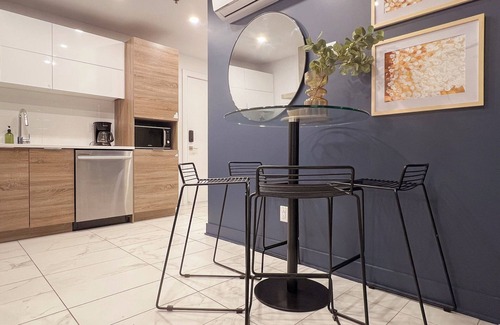 Buzz In boutique retreat is a hidden gem in a brand-new high-end building within 2 km from DT. Within proximity to Metro Vendome, includes upscale amenities such as a gym, private parking (with a fee) and an amazing rooftop terrace view. Apartments are bright and newly furnished with hand-picked modern furniture and top-quality appliances. Includes fully equipped kitchen. modern shower and bathtub to guarantee you a relaxing and soothing stay.