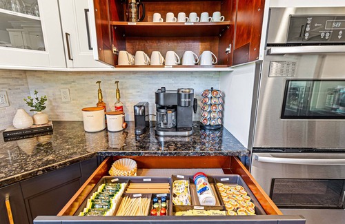 The upstairs kitchen is fully equipped with an electric range, double ovens, microwave, fridge, and all the appliances and kitchen supplies you need to whip up a feast.