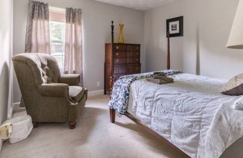 Comfortable accommodations and stocked kitchen with utensils and cookware. Master bedroom with private bath and 2 additional bedrooms with shared bathroom. Each bedroom has a TV (bring your own streaming device and remote) and recliner or chair for relaxing. Central location, in a family-oriented neighborhood, that's close to Caesars Casino, Downtown Danville, the Dan River, shopping, medical facilities, breweries and restaurants. This is also great home for accommodating a small group of professionals (6 or fewer) for a comfortable venue to get away and train your staff.