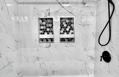 A highlight of the home is the beautifully renovated marble full bathroom, complete with double sinks and a rain shower.