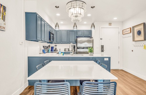 The interior is chic and modern, decorated with contemporary furnishings in a soft, neutral palette. When you're not out and about in town, you'll have an open kitchen with stainless steel appliances, including a dual oven, Keurig, drip coffee maker, a spacious dining table, and two bedrooms - each with its own bathroom and smart TV.