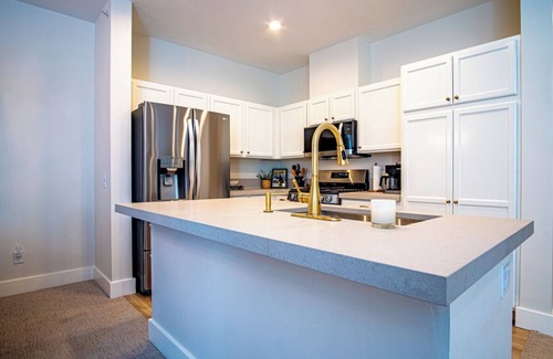 Newly renovated in 2025, the interiors are designed with your downtime in mind! The open living area features a stylish sleeper sofa and leather accent chair centered around a fireplace and Smart TV. The modern kitchen is sleek and functional with stainless steel appliances, stunning quartz countertops, and all the essentials to whip up delicious dishes.