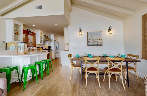 This second-level duplex is unique with spectacular views of the beach and boats in the harbor from your living room, well-equipped, full kitchen, or dining area. This newly renovated retreat has a spacious living area and a comfortable seating cluster for you all to settle in. Sliders to the outside balcony allow you to enjoy inside/outside living. Here you can dine al fresco during your stay while you enjoy the lights as they sparkle from the bay. View fireworks during the Fourth of July Boat Parade and the spectacular Newport Harbor Christmas Boat Parade, which turns directly in front of this home. Anytime you can just relax and recharge in this comfortable location between your various adventures. The barbecue grill makes cooking easy when it needs to be. There is also an inside dining table next to a beautiful modern kitchen with high-top stools at the end of a wraparound kitchen counter.