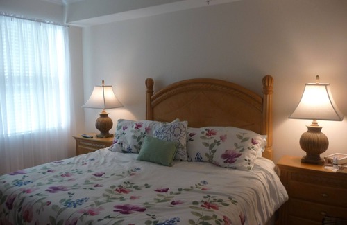 Beautifully decorated 1525 sq ft, first floor social condo, overlooking pond, with two bedrooms. The Master bedroom is furnished with a King sized bed. The other bedroom is furnished with two twin beds . There are two bathrooms.