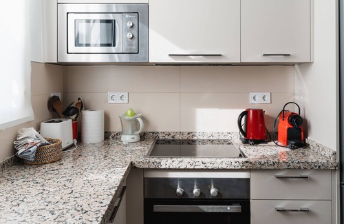 The open-plan kitchen is equipped with oven, washing machine, microwave, induction stove, fridge/freezer, and all main utensils. Two coffee machines are available: Nespresso and filter. Breakfast table with 2 chairs.