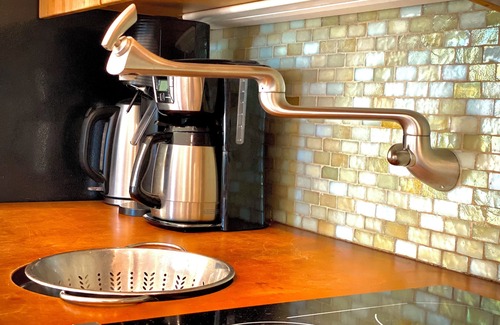 There are three more sleeping arrangements that can be semi-private or private. The coop (bedroom # 3), is a super fun two-story space with French doors to the exterior, a twin, a trundle, and convertible full on first level. In addition, this space has a delightful lofted platform on the second level with a twin bed and views of the coast to the south. This room is an ideal bunkroom for early risers because it also has the interior stairs to the second level. The big room (bedroom #5) includes cathedral ceilings, view to ocean, two sofas with memory foam mattresses; an open lofted space with two queens; and en-suite bathroom. This airy space is also connected to the terrace with outdoor stairs connecting back to main living space. Lastly, the sofa in the living room downstairs folds out into a queen. This room has heavy velvet curtains for privacy from dining room and kitchen.