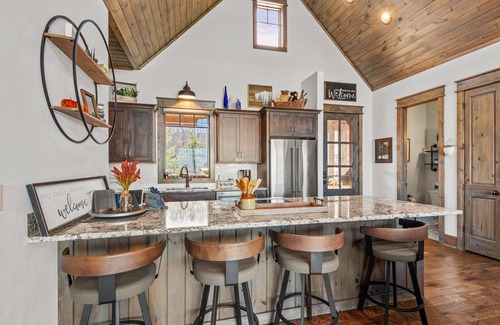 Sommer Hus features an open great room that flows seamlessly into the fully stocked kitchen and dining area, and then out to a covered outdoor sitting area on the large main level deck. Hardwood floors throughout the main living area are paired with the stacked stones of the gas fireplace, all framed by a tongue and groove cathedral ceiling. Exquisite granite counters, top of the line stainless steel appliances and bar seating make for an impressive yet very comfortable kitchen, perfect for entertaining family and friends.