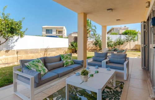 Barcarés 1 km from Alcúdia: Very large, very modern villa "Son Jil", 2 storeys, detached, built in 2005. In a quiet, sunny position residential area (villas), 2 km from the edge of the forest, 60 m from the sea, road to cross. Private: large, well-kept garden with lawn and wildlife garden, swimming pool angular (8 x 4 m, depth 150 - 150 cm, seasonal availability: 01.Jan. - 31.Dec.) with salt-electrolysis pool-cleaning system. Outdoor shower, patio, arbour, pergola, garden furniture, barbecue. In the house: internet access, WiFi, central heating system, air conditioning, washing machine. Public car park, public parking on the road. Shop 1 km, supermarket 1.2 km, shopping centre 45 km, restaurant 160 m, bar, pedestrian zone 50 m, 15 minute walk to the centre, bus stop 1.5 km, ferry 3 km, sandy beach "Platja Es Morer Vermell" 550 m, rocky beach "Platja Es Barcarés" 60 m. Sports harbour 250 m, marina 3 km, golf course (18 hole) 6 km, tennis 2.5 km, riding stable 2.5 km, sports centre 2.5 km, walking paths from the house 1 km, cycle lane 700 m, children's playground 500 m. Nearby attractions: Ermita de la Victoria, Barcarés, Manresa, Sa Marina, Es Malpas. Ciutat Romana de Pollentia, Alcudia. Port d'Alcúdia, Port de Pollença - Pollença, North Beaches. Hiking paths: Sa Talaia, Es Puig de Sant Martí, Serra Tramuntana Pollença. Please note: suitable for families, suitable for seniors. Object suitable for 8 adults groups of teenagers on request only. Airfield 60 km from the property.