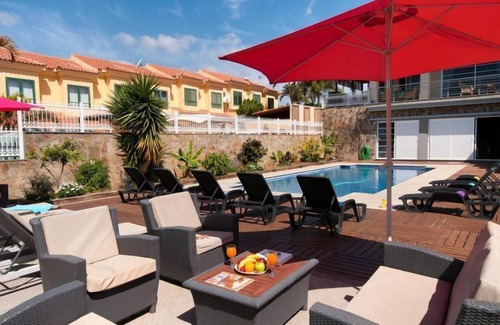 Large, comfortable single-family house. On the outskirts Maspalomas, in a quiet position. Private: garden (fenced) with lawn, swimming pool angular (11 x 5 m, depth 160 - 140 cm, seasonal availability: 01.Jan. - 31.Dec.). Outdoor shower, patio, garden furniture, barbecue. In the house: billiard table. Single garage, public parking on the road. Bus stop "Vistamar" 30 m. The owner does not accept any youth groups. Neighbourhood highly sensitive to noise. Quietness and good behaviour expected.