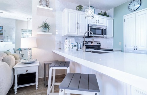 - Fully remodeled kitchen that has all of there major appliances, along with cookware. The counter has two swivel chairs, there are lots of cabinets, and complete cookware well.