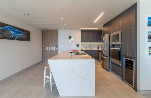 Spacious 3BR/3BA Sonoran Star condo with oceanfront balcony, luxurious master suite, and king beds in all bedrooms. Open living area with leather sofas, wall-mounted TV, dining for 8, and a fully equipped kitchen with stainless steel appliances and wine fridge. Enjoy resort amenities: pools, lazy river, jacuzzis, private beach, fitness center, and on-site dining. Perfect for families or groups seeking comfort, space, and ocean views.