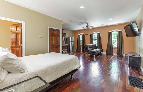 The rear carriage house has a private entrance, a queen bed, 1 sofa bed, 1 full equipped kitchenette (no oven), 1 dinning table, 1 complete bathroom with a shower/bathtub, combo, TV, and full garage for two cars.