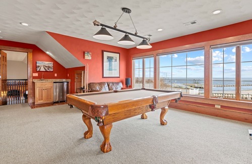 More relaxing happens on the second level. For starters, this level features a king bedroom, as well as another room containing two double beds joined by a full bathroom. In the room above the garage, there is a pool table and a foosball table, a surround sound system, a wet bar and a large flat screen T.V. There are also 2 queen pull-outs and a full bath. There are plenty of memories to be made in this area, and all while the Currituck Sound sits blissfully within view from the magnificent bay windows.