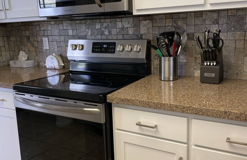 This luxurious condo unit boasts a comfortable living room and a fully equipped kitchen with quartz countertops and stainless steel appliances. The primary bedroom has a king size bed and spacious en-suite, and the completely private guest bedroom has a queen size bed. Each bedroom features its own adjacent bathroom.