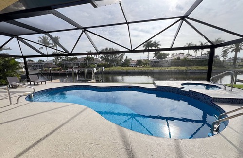 This Cape Coral Home sits on a Beautiful canal with Southern Exposure so You will have Sun all day long on the pool and lanai. Watch the fish Jump all day long in the canal and if you rent a boat there is a place for it right out back! Great Fishing for everyone right at your dock!! The home itself is perfectly decorated and kept in pristine condition. If there are any issues the Owner takes care of it immediately!! For instance we now have a brand new UV lights in the A/C for anyone with allergies just to be sure everyone is comfortable!! The spa has a brand new system easily controlled by an app! The open floor plan and layout of this home really makes it easy to be anywhere in the living room or kitchen and you can still be part of the conversation and fun with your family. Direct TV in the Living room, Lanai, and 2 bedrooms. There are 3 bedrooms, the master has a king size bed and its own private bathroom. The 2nd bedroom has a queen bed and the 3rd has a full size bed, they share a bathroom which is also a pool bath so no one has to drip through the entire home if your enjoying a pool day! The Pool is picture perfect and facing South so SUN SUN SUN with plenty of chairs to relax in if you want sun or even if you don't want sun, the covered lanai will give you that option of you need it. This home has a hot tub which can be heated whenever you would like to use it!! It heats up fast too if last minute you decide to use it!! At this home you have a stocked Kitchen and Grill outside to use whenever you like. Top of the line front loading Washing Machine and Dryer. We also have a printer should you need it to print up boarding passes. Fishing Poles, Beach Chairs and Beach Umbrella for you to use. The home is in a beautiful little neighborhood where Royal Palms line the street. Pulling up to this home the tile roof and look of this home is perfectly maintained and well taken care of. Inside you will find the same, a beautiful well taken care of home that you will feel comfortable and really enjoy your vacation. Remember .... Location Location Location! This is close to everything and yet tucked away in your own quiet little neighborhood! This 3 bedroom 2 bathroom Southern Exposure pool home is a Gem. If you are boating then it is a few minute ride to the river and if you are walking then you are close enough to walk Publix, Super Walmart, Bowling, Movie theatre, Home Goods, Ulta, Bealls, Starbucks, Gym, The Eco Preserve with over a mile of walking trails and the list could go on and on. You won't be disappointed with the home or its location!!!