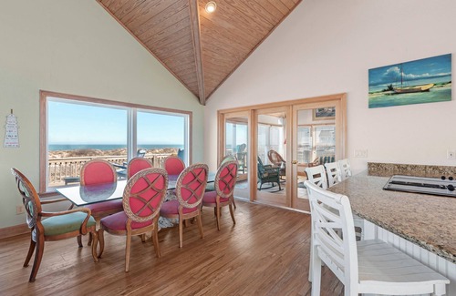 Back at the house, a spacious oceanfront deck spans the width of the home and is the perfect place for watching the sunrise with a cup of coffee. Inside, the open-concept layout in the great room provides plenty of space to gather or spread out. Features include vaulted ceilings, a cozy gas fireplace (off-season only) and large picture windows that showcase the unobstructed ocean views. French doors lead to a sun room located right off the dining area where you can curl up with a book or catch up with family and friends. The chef in your group will appreciate the well-equipped kitchen with granite countertops and stainless steel appliances. A double oven and two dishwashers make cooking and clean up for large groups a breeze. At the end of the night, retreat to the top-level primary bedroom, an oceanfront suite that offers deck access along with a newly renovated private bath with spacious walk-in shower.
