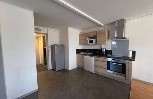 Il se trouve au premier étage de la résidence, se compose d'une entrée avec de grand placard, d'une salle d'eau rénové avec douche et WC, d'une cuisine aménagée et équipée ouverte sur le séjour offrant un joli coin repas avec accès au balcon, un salon avec canapé et fauteuil se transformant en espace couchage (avec rideau de séparation et canapé lit confortable 140*190) et d'une grande chambre avec lit double (140*190) et un lit simple (90*190)