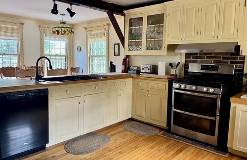 The farmhouse kitchen has room for multiple cooks, and is fully stocked with cookware, useful spices, a lobster pot, dinnerware, glassware, and silverware. The large wrap around deck and patio offers loads of space for leisurely meals and grilling, the gas is provided.