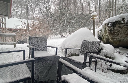 Enjoy your getaway In our mountain side home featuring 3 master bedrooms. An open concept newly renovated living room with high ceilings, is the perfect space to kick back, and roast some delicious marshmallows by the fireplace.
