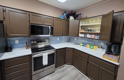 Welcome to this spacious, newly renovated home in the heart of Meridian! Just minutes from The Village and Downtown, it's tucked away at the end of a quiet cul-de-sac. Enjoy brand-new quartz counters, appliances, flooring, lighting, and furniture! With plenty of cozy indoor and outdoor seating, this home offers your family the perfect blend of comfort, style, and convenience. The kitchen is fully stocked with everything you need for cooking, serving drinks, or brewing a morning cup of coffee!