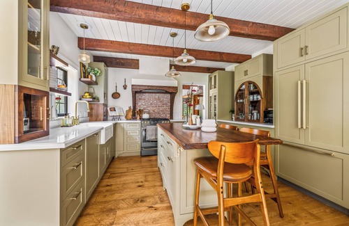 Today, the home has been thoughtfully re-imagined by its current owner—also an artist—who was inspired by the soul of the space and the legacy left behind. While preserving the original heart of the home, they introduced a warm, country-modern style. Yellow pine resewn flooring, imported from a Georgia mill, sets the tone. The kitchen is a masterpiece in itself, featuring custom walnut cabinetry and hand-crafted details throughout.