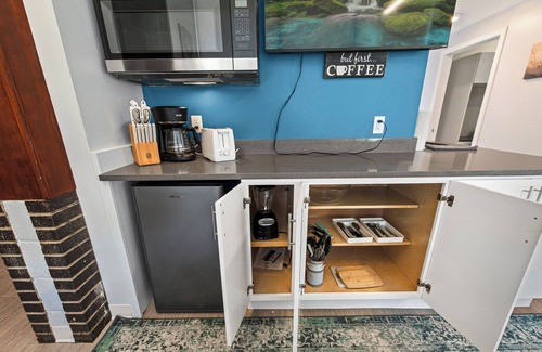 ~Kitchenette: The pod has a microwave, minifridge, and a coffeemaker.