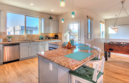 A patio fire pit and luxurious rooftop deck make this 4BR/3.5BA home perfect for your next ocean getaway. Play a game of foosball while the kids try out the Play Station 3. A pedestrian walkway off the backyard leads straight to the shore. Sleeps 10.
