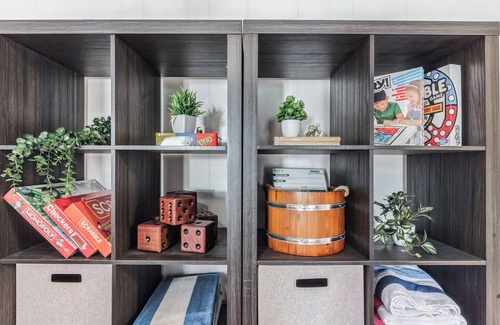 The fully stocked kitchen, featuring a Keurig Duo coffee maker, is perfect for culinary creations. The second living area offers a queen sleeper sofa, a cozy fireplace, and a variety of games. The adjacent laundry room provides quick wash appliances and plenty of storage.