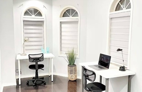 Welcome to your stylish 5-bedroom retreat! This spacious apartment is designed for relaxation and convenience. Enjoy 4 cozy bedrooms with 5 beds, an office with pull-out couch and dedicated workspace with 2 tables. With 3 bathrooms, combined having a shower, bathtub, and jacuzzi, you’ll feel pampered. The sleek kitchen has a bar with swivel chairs, perfect for coffee or cocktails. Step outside to a serene backyard seating area and a mulberry tree. Ideal for families, groups, or work trips!
