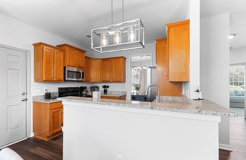 Enjoy a fully stocked kitchen with all cookware, utensils, and modern appliances—perfect for preparing group meals or family breakfasts. Whether you're making a simple snack or a full holiday spread, everything you need is right at your fingertips. The dining area offers plenty of seating for shared meals and game nights.