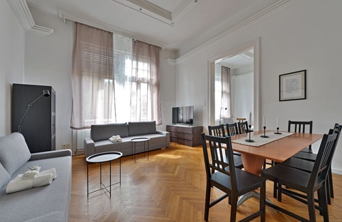 The biggest apartment that can be found in this building. It has 2 separated bedrooms, a living room with 2 sofa beds, 1.5 bathrooms, a hall and a kitchen as well. It sleeps a total of 8 guests, yet you won't feel crowded even at full capacity. The location of the apartment is as good as it gets as well: close to shops, markets, public transport and attractions. Located in the historical 1st district.